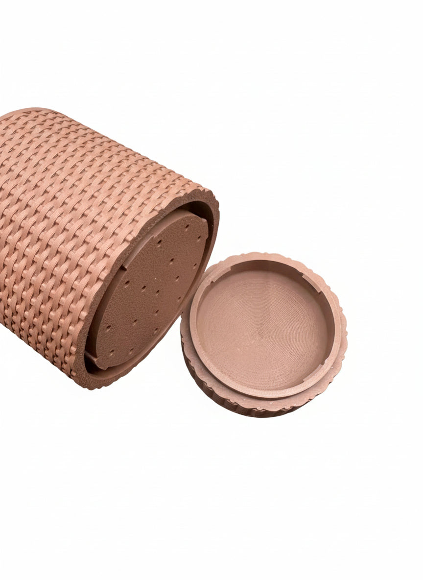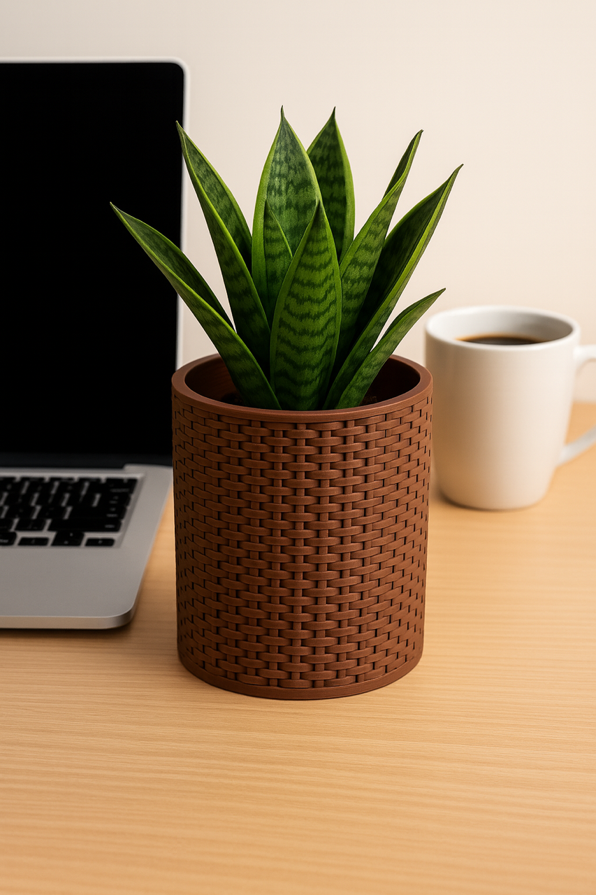 Krukan är 3D-printad i hållbart PLA, ett biobaserat och miljövänligt material som ger en matt, sofistikerad yta med diskret struktur. Den kompakta storleken är idealisk för mindre växter, kaktusar eller suckulenter. Den avtagbara droppbrickan gör det enkelt att hantera överflödigt vatten och bidrar till en ren och praktisk växtskötsel — perfekt anpassad för kontorsmiljöer där enkelhet och ordning är viktigt. Tillsammans skapar detta en lugn och professionell atmosfär utan att ta onödig plats.