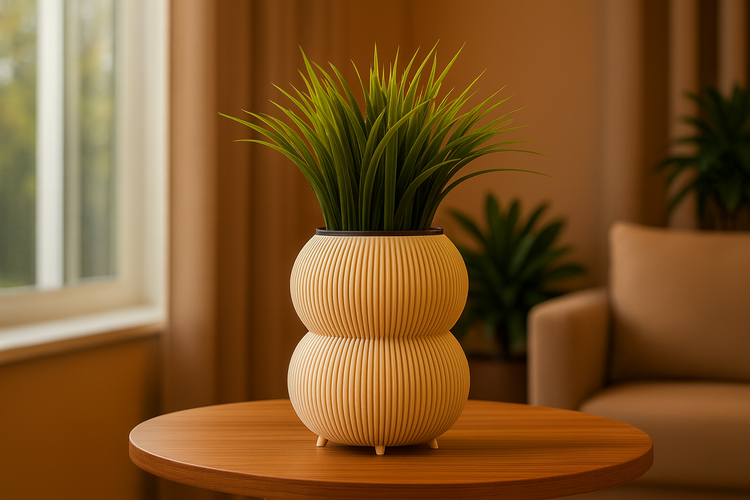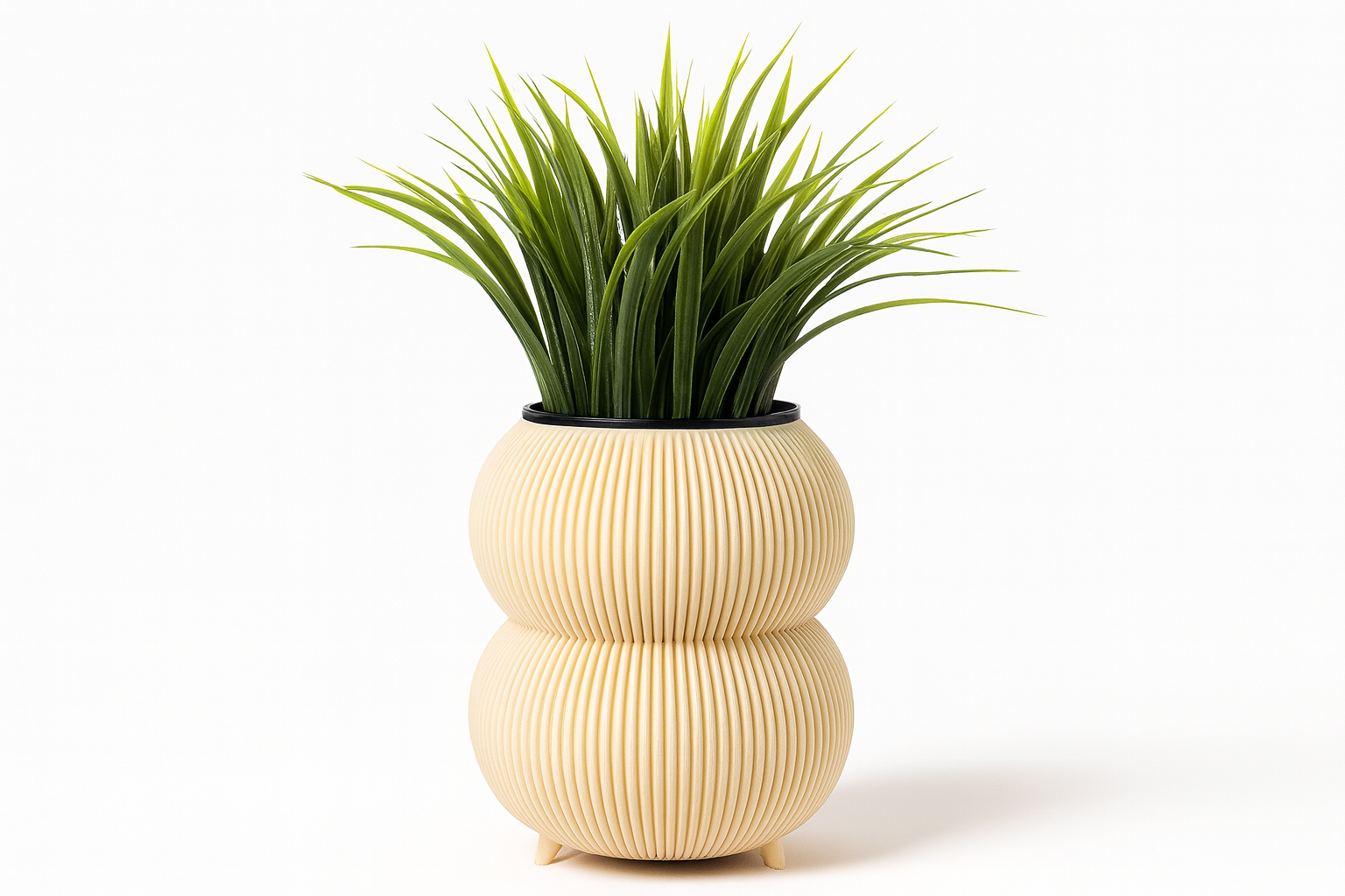 Stilfull 3D-printad kruka med modern ribbad design. Perfekt för både riktiga och konstgjorda växter, den ger ditt hem en trendig och stilren känsla. Placera den i vardagsrummet, köket eller vid fönstret för en lyxig touch av grönska. 🌿