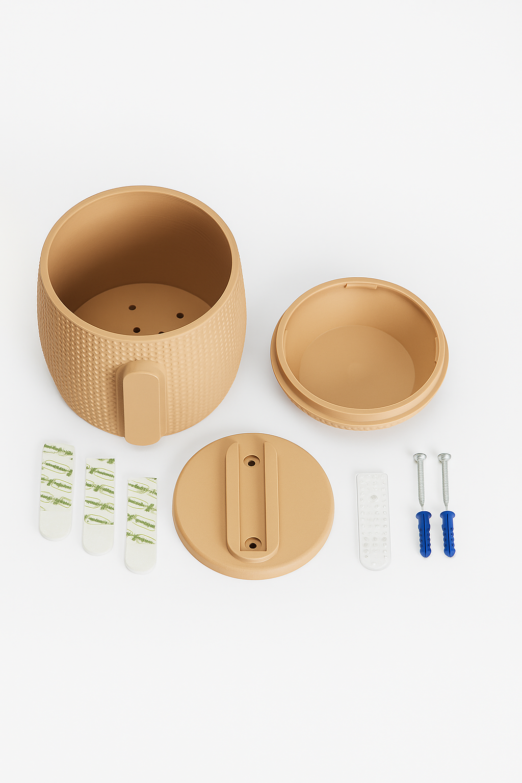 Med sin sofistikerade textur och minimalistiska form blir krukan en elegant detalj i både moderna hem och kontorsmiljöer. Monteringen är enkel och flexibel – välj mellan skruv för ett stabilt fäste eller den medföljande command självhäftande remsor för en smidig installation.